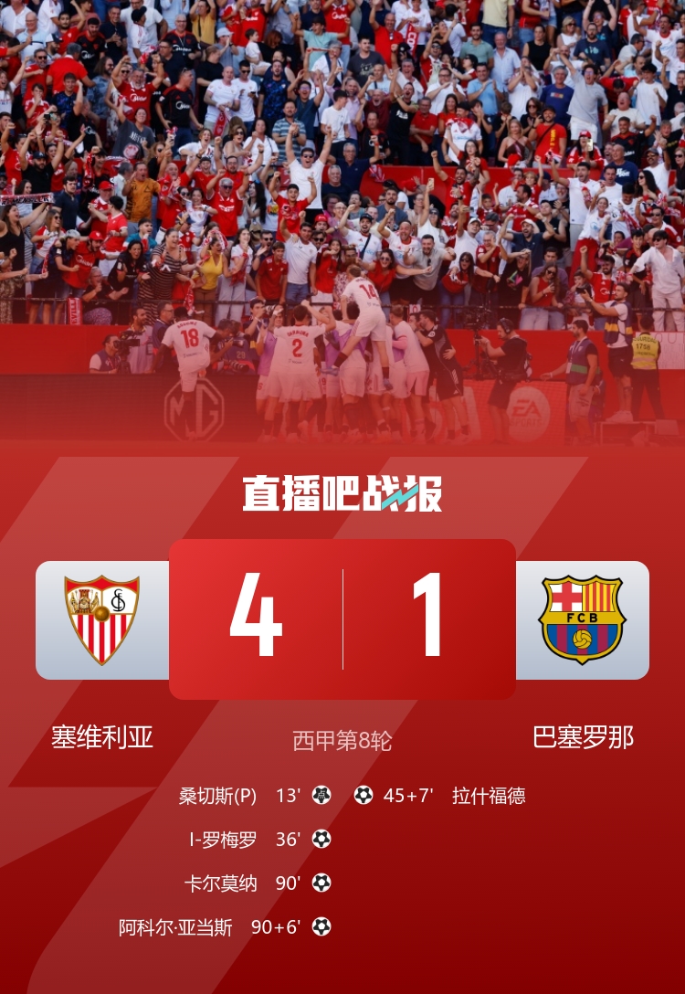 比赛还未结束,第90+3分钟,巴萨的佩克因犯规被罚下,但经过VAR复审后判罚仅为黄牌。目前巴萨面临艰难局面,而塞维利亚的阿尔科-亚当斯在第90+6分钟锁定胜局,最终以4-1大胜巴萨,巴萨在各项赛事上遭遇两连败,积分榜上距离榜首又退后了两分。
