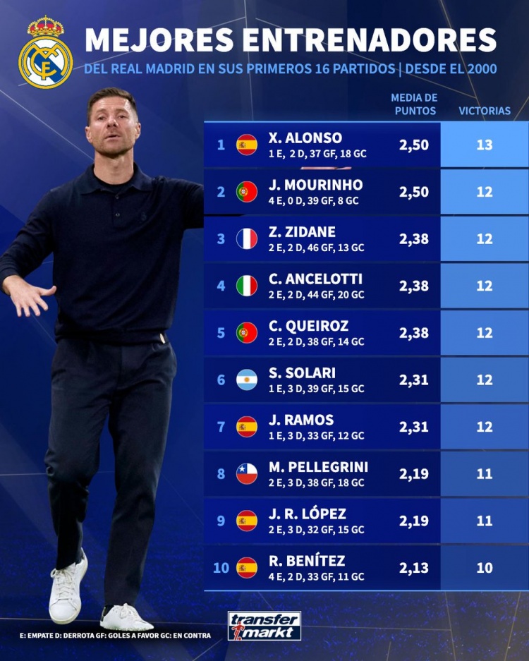 首先,卓尔不群的阿隆索如同璀璨的明星,在他的前16场执教赛事中取得了惊人的13场胜利,俨然成为了所有教练中的佼佼者。他以超过2.5分的得分,刷新了我们对执教初期成功的认知。而与此同时,穆里尼奥、齐达内和安切洛蒂这三位足坛传奇也并肩而立,各自以12场胜利的成绩,闪耀在历史舞台上。