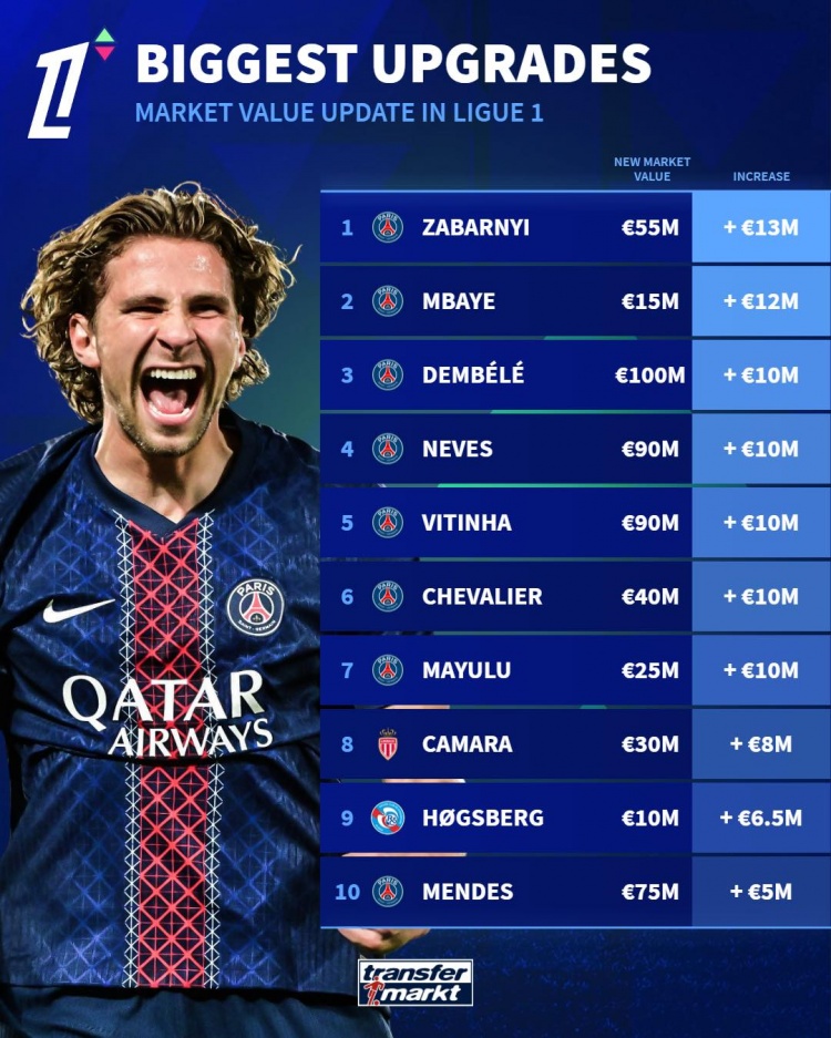 在法甲的身价上涨榜上,我们看到扎巴尔尼的身价像火箭一般飞升,直接涨了1300万欧,轻松登顶。别问为什么,只要看看他身后那些巴黎球员就知道了——说真的,他们简直是一群身价飙升的富豪,好像每场比赛都在进行一场“身价牛逼大赛”。