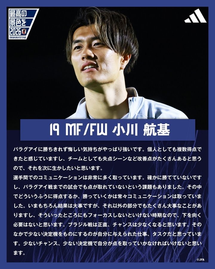 展望与巴西队的对决,小川航基表示:“与巴西队的较量,机会会显得非常珍贵。我的职责就是要在这些有限的机会中把握住,为球队送上进球。尽管机会稀少,我仍需全力以赴,争取能够把握这些难得的时刻,助力球队走向胜利。”他的话中流露出坚定的决心,显示出对于球队未来的期待和对个人使命的认同。